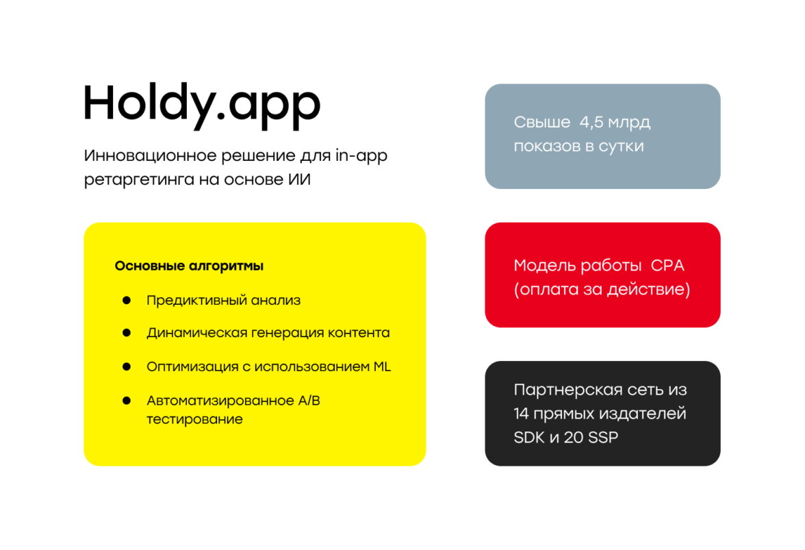 Еще одним направлением деятельности Mediasurfer является проведение ретаргетинговых кампаний. Для этих задач разработана платформа на основе искусственного интеллекта — Holdy.app, обрабатывающая более 4,5 миллиарда показов ежедневно. Партнерская сеть включает 14 прямых издателей SDK и 20 SSP, обеспечивая охват различных сегментов аудитории.
