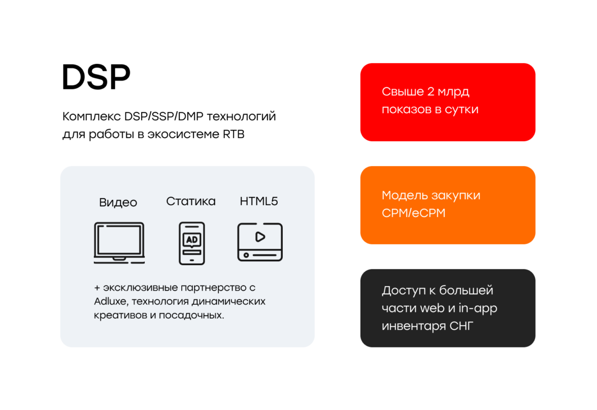 DSP дает доступ к большей части web и in-app площадок СНГ, применяя модели закупки CPM/eCPM и обеспечивая свыше 2 млрд показов в сутки. Что касается форматов рекламы — платформа поддерживает видео, статические изображения и HTML5.