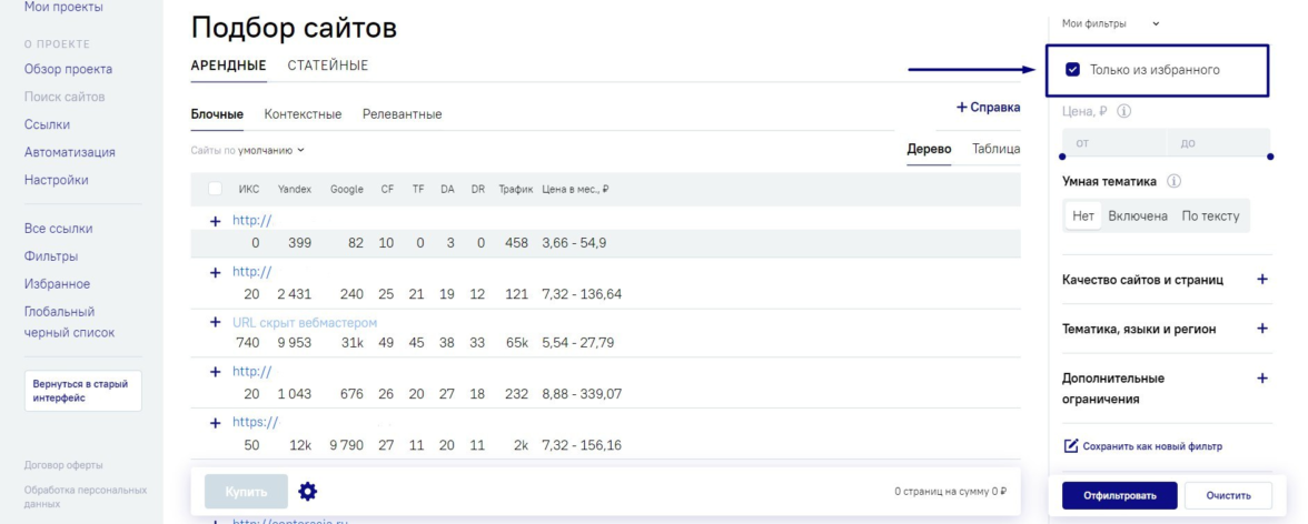Далее при подборе площадок поставьте в меню справа галочку напротив ячейки «Только из избранного». Так, поиск будет проводиться только среди сайтов с быстрой простановкой ссылок.