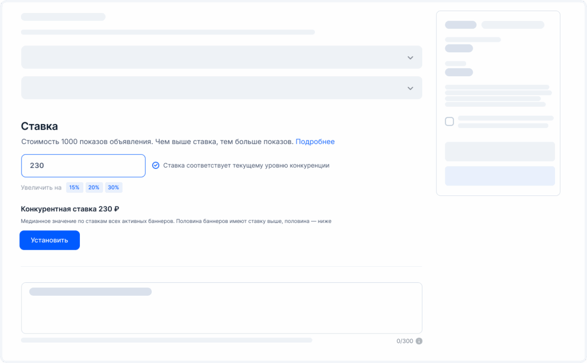 2. CPM, или оплата за показ. Минимальные ставки — 135 рублей за 1000 показов на главной и в поиске и от 250 рублей за 1000 показов в товарных категориях. При оплате за показы рекламодатель платит в размере ставки, которую он установил.