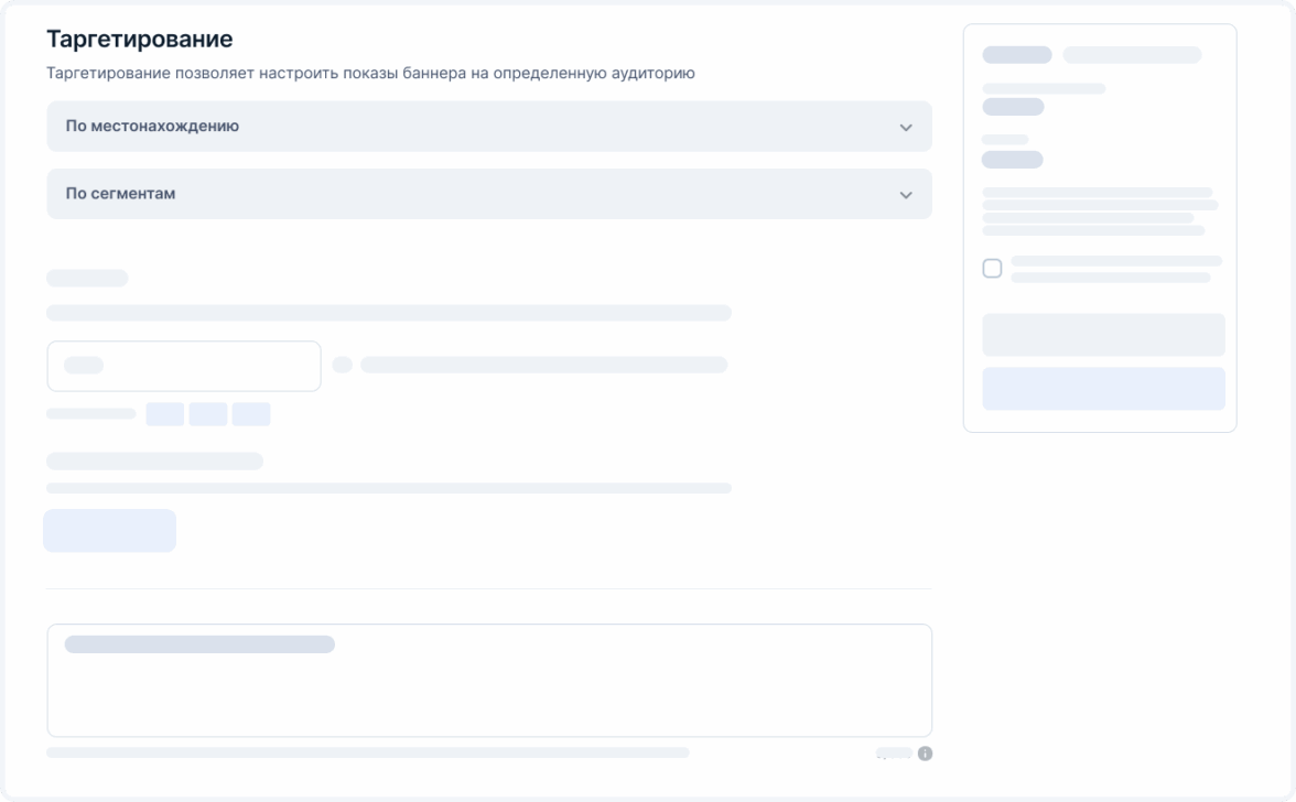 Таргетинг можно настраивать по местонахождению, запросам, категориям, сегментам и другим параметрам.