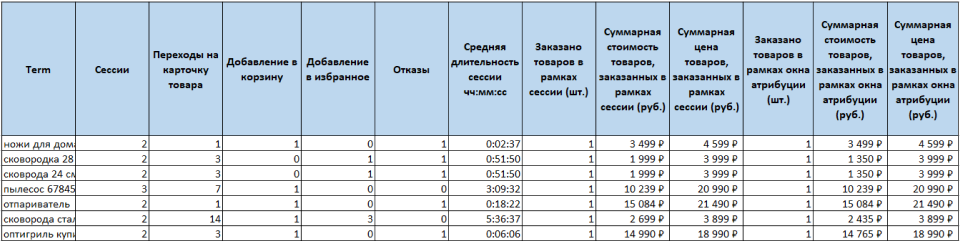 Данные можно получить вплоть до ключевого слова. В отчете по заказам и доходу выделяются два типа заказов: «Заказы в рамках сессии» и «Заказы в рамках окна атрибуции».