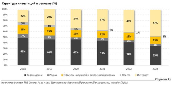По оценке агентства Wunder Digital на втором месте по объёмам рекламных бюджетов телевидение. Но если в 2018 году 49% всех рекламных инвестиций приходились на ТВ, то спустя пять лет — только 35%. Спрос на наружную рекламу остается стабильным последние два года — доля 13%. Снижается интерес казахских рекламодателей к рекламе на радио и в прессе. Аудиореклама занимает всего 3% рекламных инвестиций, в прессе — 1%.