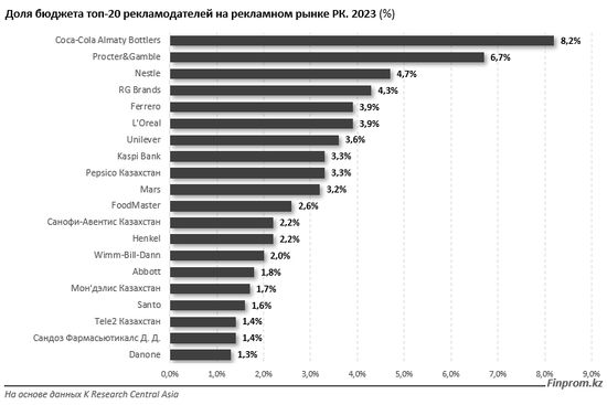 В Казахстане, как в России и Беларуси, до 2022 года, медийный рынок обеспечивают FMCG-компании. По данным Research Central Asia, в топе рекламодателей за 2023 год лидировали Coca-Cola, P&G и Nestle. В топ-5 всего один местный рекламодатель — производитель напитков RG brands.