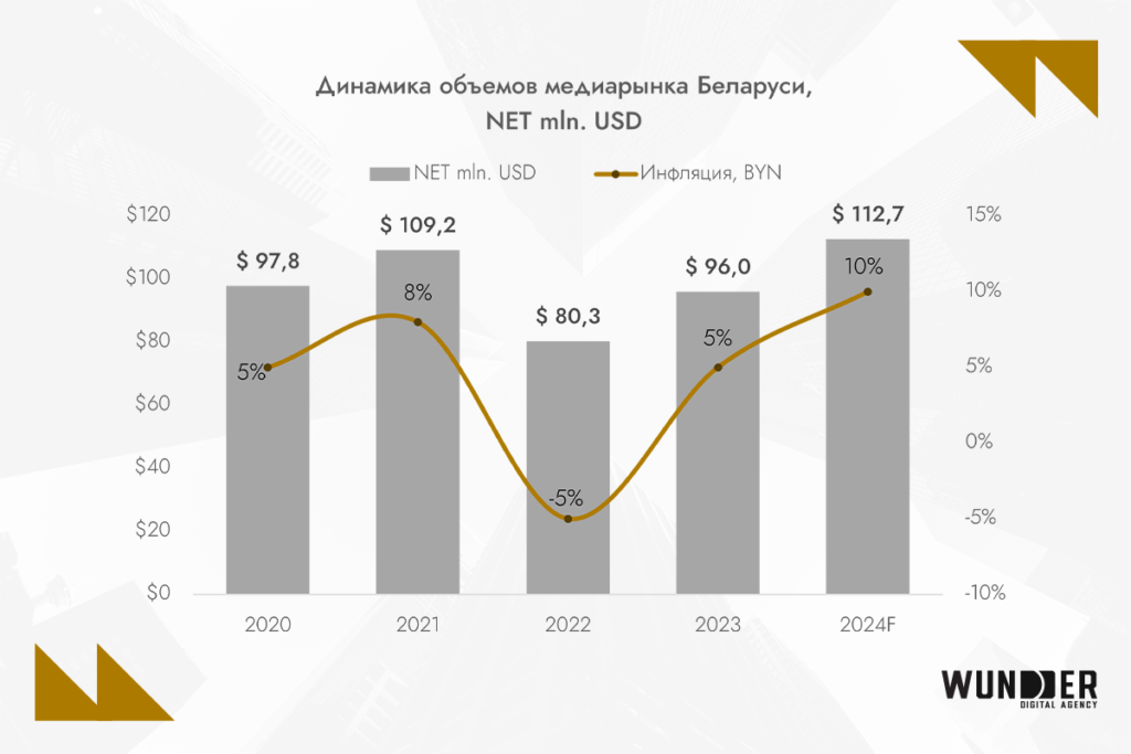 Рекламный рынок Беларуси вырастет на 15-20%, до $112,7 млн в 2024 году при медиаинфляции 7-10%, прогнозирует digital-агентство Wunder Digital (работает на рынке СНГ со штаб-квартирой в Казахстане). В 2023 году, по оценке агентства, его объем вырос на 17-20%.