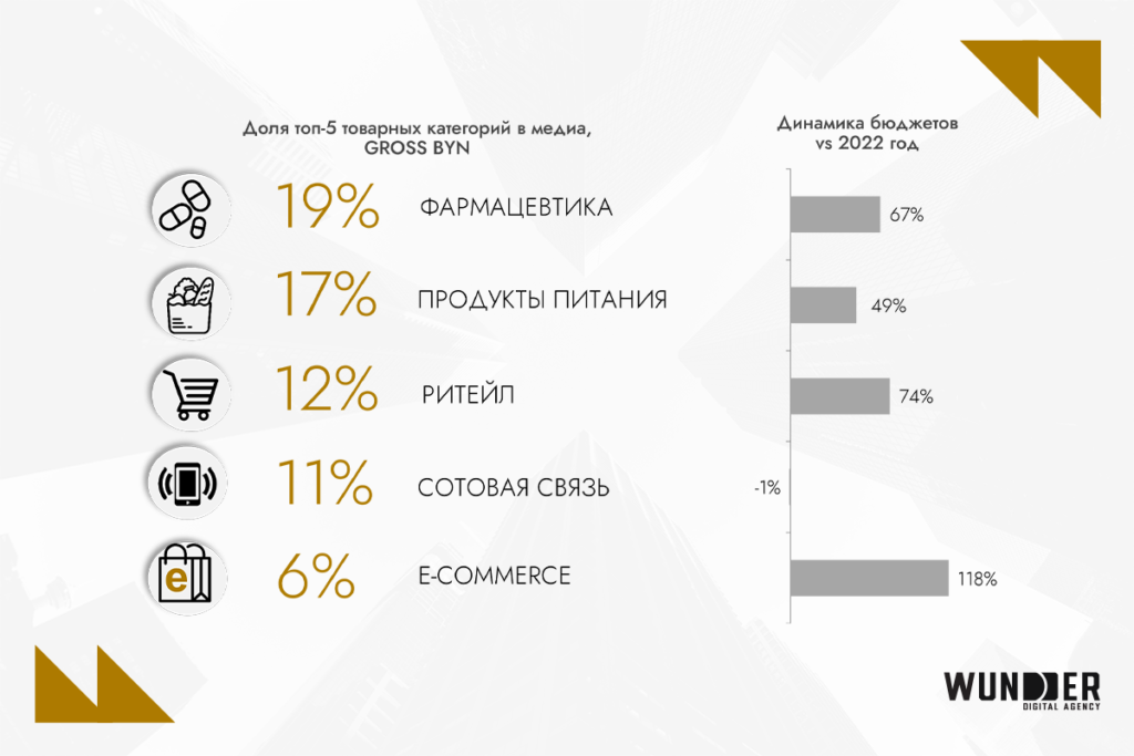 Лидирующими рекламодателями в стране являются фармацевтические компании, производители продуктов питания, ритейлеры и e-com. Самый динамичный рост в 2023 году показывали e-com-рекламодатели — плюс 118%. На 2023 год в Беларуси было зарегистрировано около 30 тыс. интернет-магазинов. Доля маркетплейсов в интернет-продажах составляет 40%, а доля интернет-торговли в общем объеме розничного товарооборота страны составляет — 6%. Доминирующие игроки: Wildberries и Ozon.
