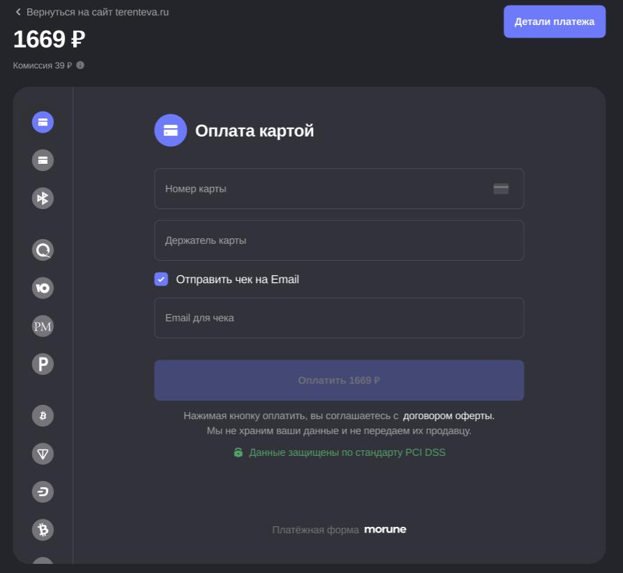 Одно из главных преимуществ Morune.com — это его простота и удобство использования. Интерфейс сервиса интуитивно понятен, поэтому настройка параметров оплаты займет у вас минимум времени. Кроме того, Morune поддерживает множество способов оплаты, включая банковские карты, электронные кошельки, СБП и криптовалюты.