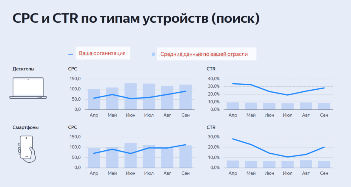 Показатель CTR зависит от отрасли. Если есть персональный менеджер в Директе, запросите индустриальный отчет. В нем собраны данные о средних показателях CTR в вашей сфере. Можно увидеть разницу между поиском и РСЯ, между мобильными устройствами и десктопами. Это поможет оценить результаты на фоне конкурентов.