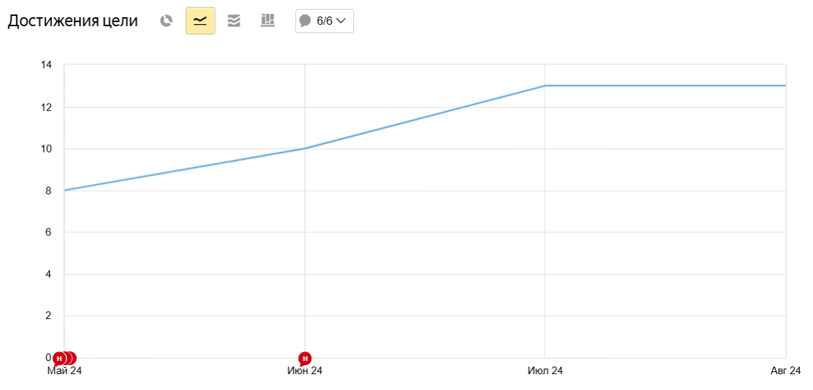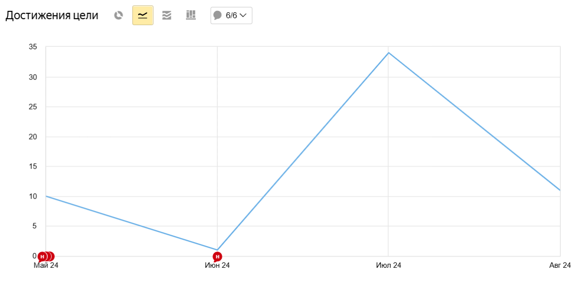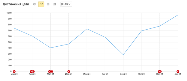 Работу начали с фиксации в системе аналитики отправки каждого обращения, звонка, добавления товара в корзину и, конечно, покупок. Некоторые цели состоят из нескольких этапов и фиксируют каждый шаг потенциального покупателя с первого касания.