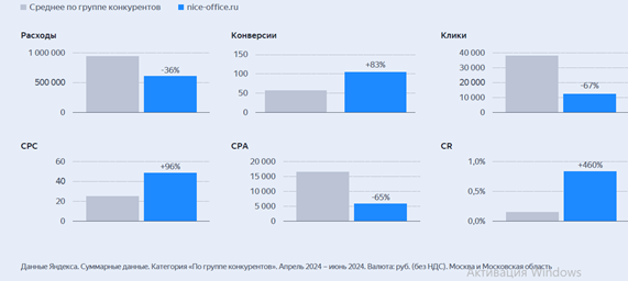 Летом стали готовиться к осеннему сезону и запросили в Яндекс отчет-сравнение с заданными конкурентами. Результаты убедили в правильности подхода. По основным метрикам мы не только росли относительно своих показателей, но и относительно конкурентов.
