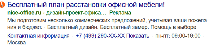 Компания Nice-office делает дизайн-макет интерьера в подарок. Поэтому мы решили протестировать аудиторию пользователей, которые интересуются дизайном офиса и создали новую РК с показами на поиске. В качестве УТП предложили получить макет дизайна с расстановкой мебели из ассортимента nice-office.ru.