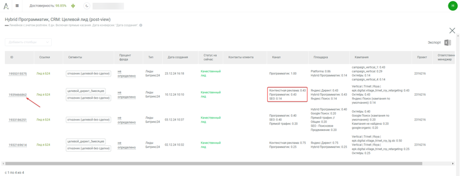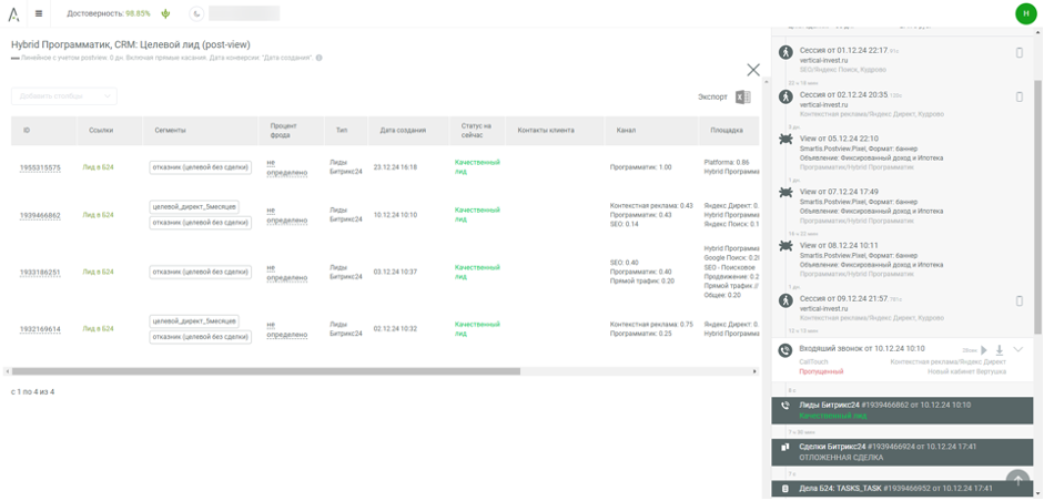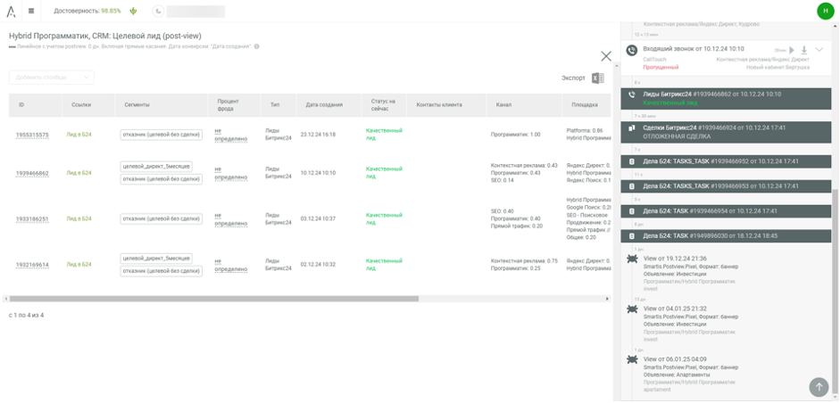 В нашей рекламной кампании Smartis позволяла отследить взаимодействие пользователей с рекламными материалами и долю их влияния на конверсии.