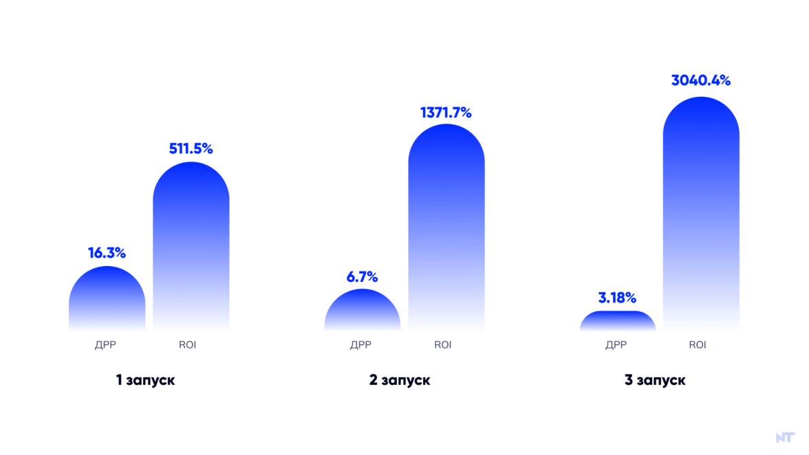 За время сотрудничества ROI вырос в 5,9 раз по сравнению с первой кампанией и составил 3040.4% в третьем запуске. При этом, NT удалось сократить долю рекламных расходов: в третьей рекламной кампании показатель составил 3,18%.