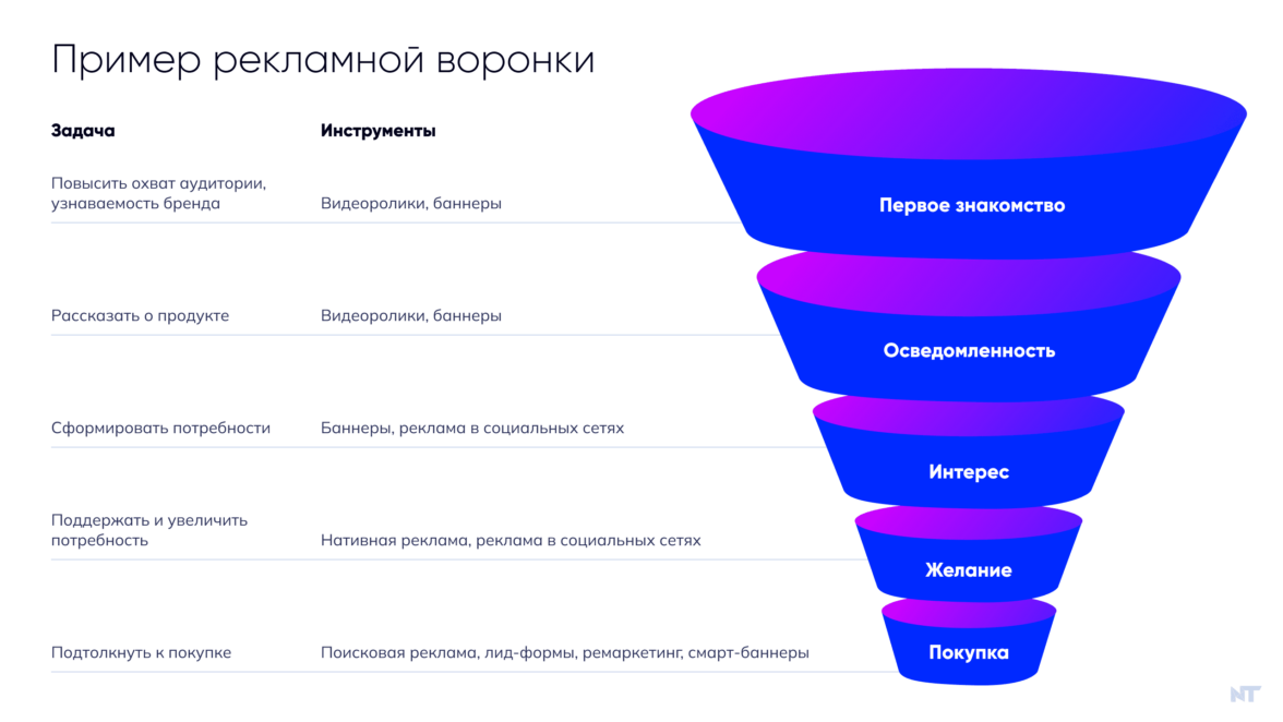 Чтобы провести аудиторию по воронке от узнаваемости до покупки, бренды используют разные форматы и каналы. Рекламная воронка строится и наполняется форматами в зависимости от customer journey. Когда ограничений нет, воронка может выглядеть так:
