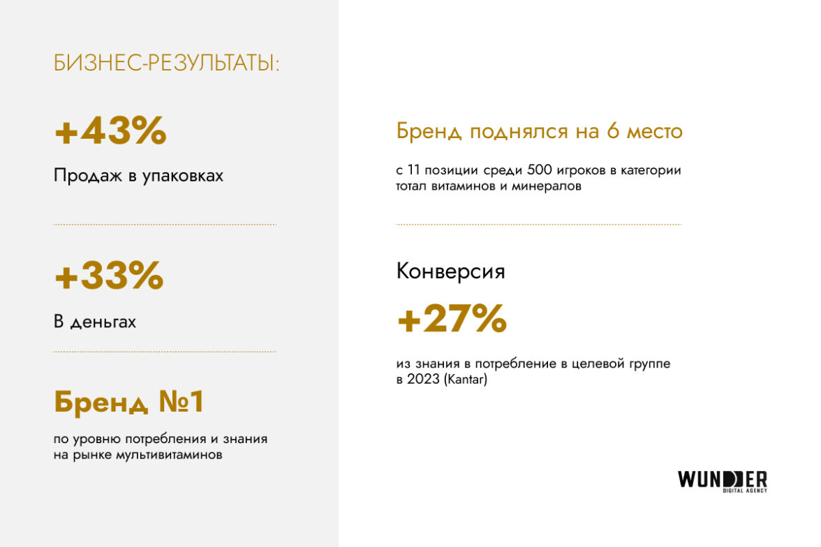 Нестандартный подход с использованием новых инструментов позволили повысить прибыль, увеличить продажи в упаковках и конверсию (из знания в потребление), а также занять лидирующую позицию на рынке мультивитаминов.