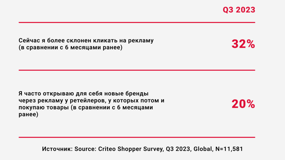 Кроме того, в этот период люди чаще кликают на объявления, которые помогают им найти интересующие их товары. Около трети покупателей утверждают: в скидочный сезон они с большей вероятностью нажмут на рекламу, чем шесть месяцев назад.