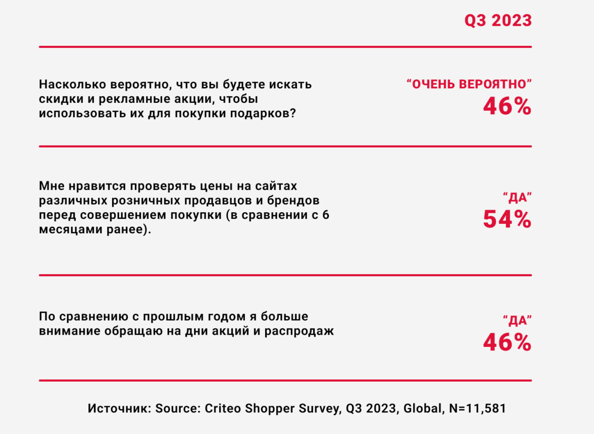 У осенней сезонной распродажи есть свои особенности. Что логично: не каждый день пользователь окружен таким большим разнообразием скидок и предложений. Ниже приводим данные из исследования Criteo Shopper Survey.