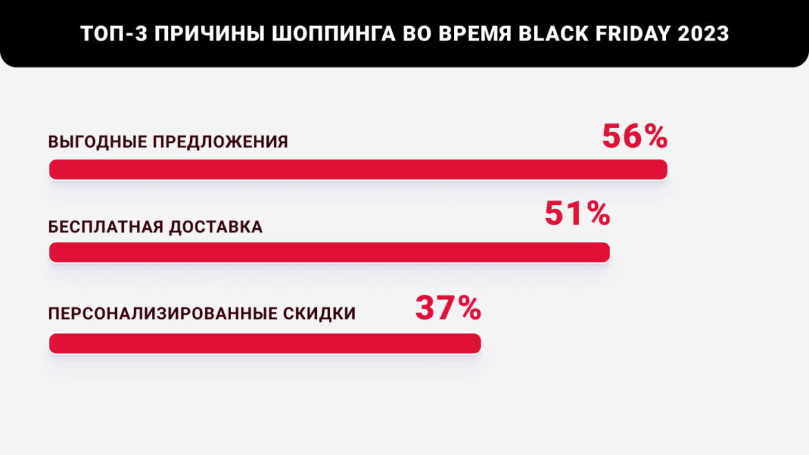 В процессе покупок ключевыми мотиваторами являются выгодные предложения (56%). За ними следуют бесплатная доставка (51%) и скидки, которые невозможно найти в других магазинах (37%).