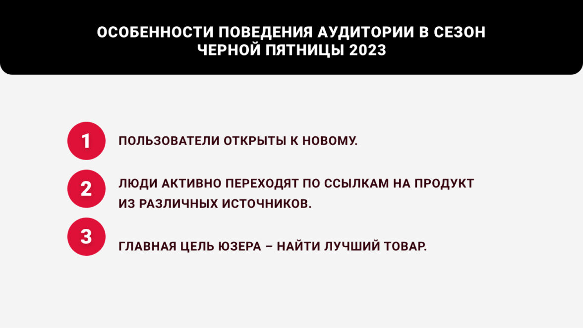 Выше мы перечислили особенности потребительского поведения в сезон Черной Пятницы. Если кратко, то: