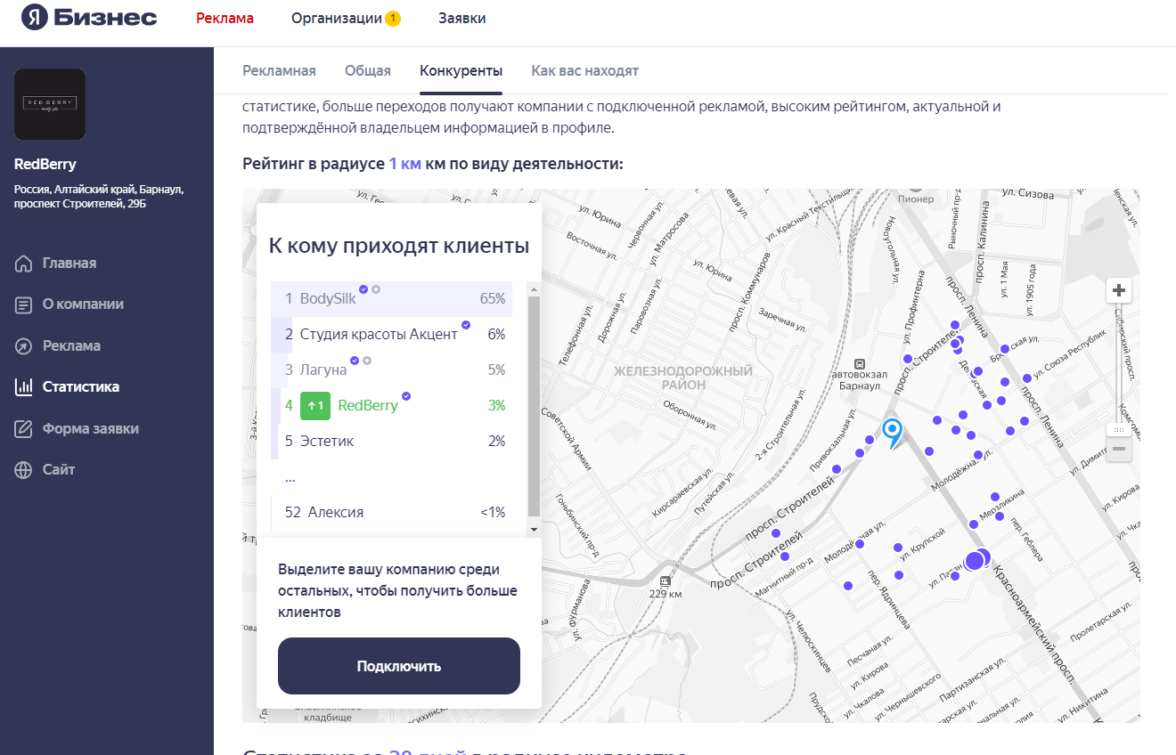 Профиль RedBerry стал заметнее в Яндекс.Картах, тем самым увеличилась конкурентоспособность среди салонов.