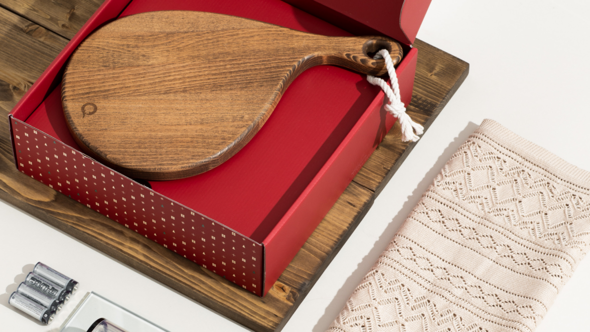 В набор входили три вещи разных форм и из разных материалов: деревянная доска для резки, электрический штопор и вязаная дорожка. Коробку в данном случае мы разрабатывали самостоятельно, так как нужно было учесть очень много нюансов: изделия должны помещаться и удобно лежать, упаковка должна производить впечатление и быть транспортируемой.