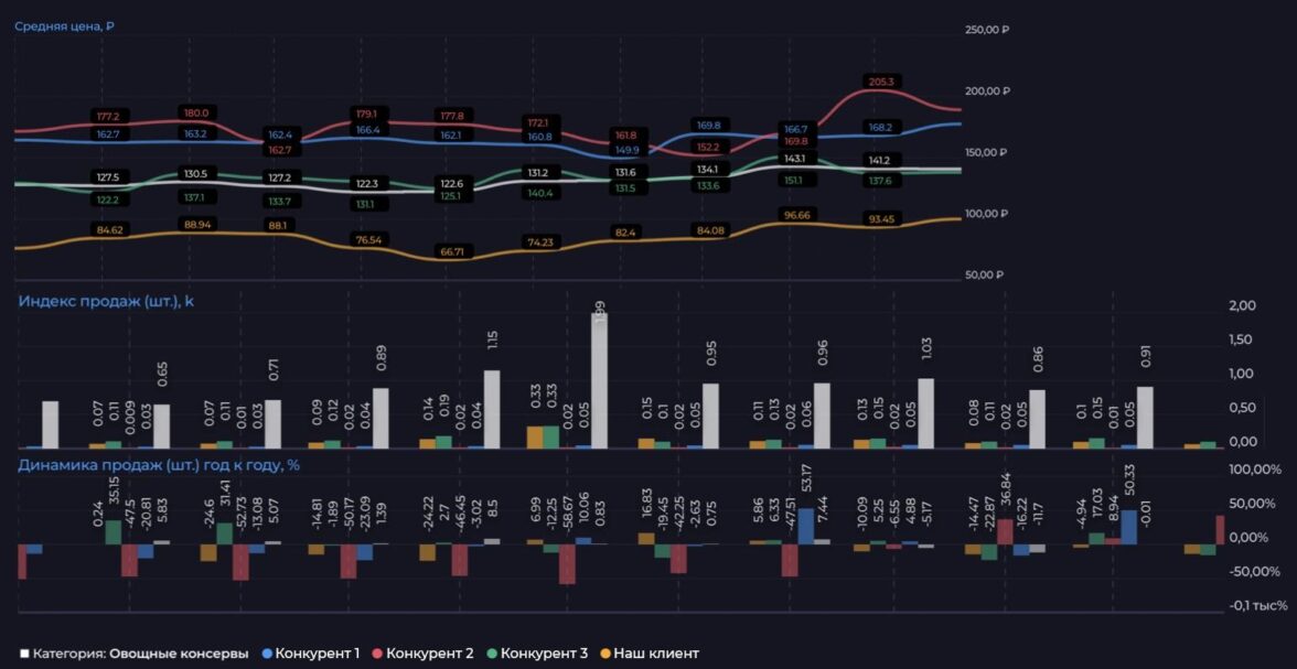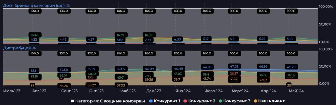 Наш клиент — бренд овощных закусок с более чем 20-летней историей развития компании на рынке. Под брендом производят консервированные овощи и готовые овощные закуски в стеклянных и жестяных банках: горошек, кукуруза, фасоль, нут, маринады, овощная икра и так далее. Продукты марки можно купить на маркетплейсах и в крупных торговых сетях России.