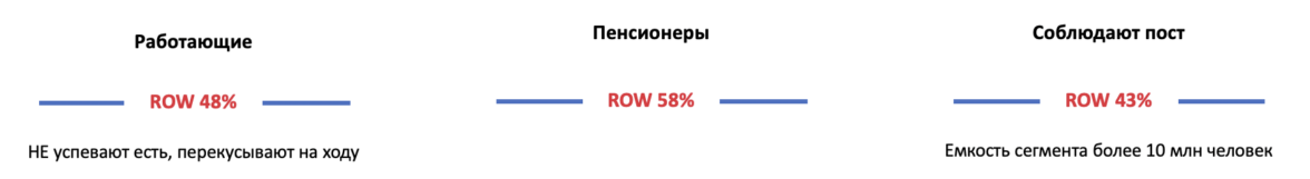 Таргетинг на пенсионеров и работающих можно использовать как уточняющий на протяжении всего периода РК. Постящихся берем как фокусный сегмент только на период поста.