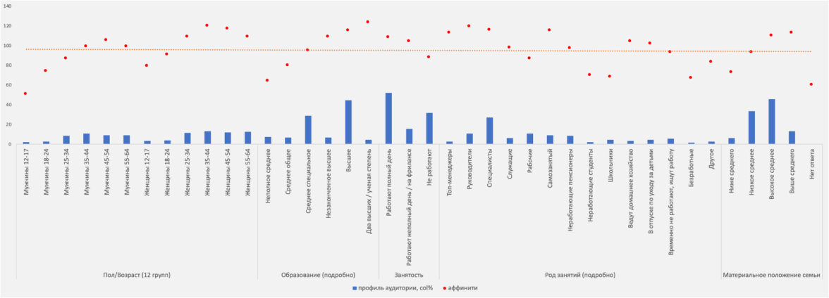 Ядро нашей целевой аудитории: мужчины 35–64 и женщины 25–64 с высшим образованием, средним доходом, женаты/замужем.