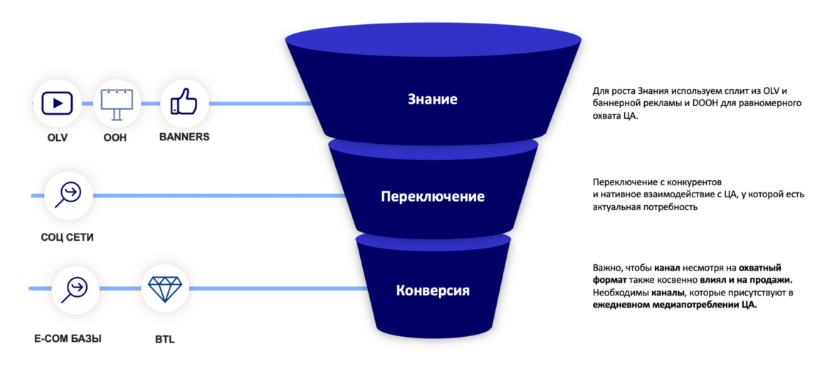 OLV в этой схеме дает нам максимально качественный охват, баннеры — увеличение частоты контакта. А дополнительное использование в этих каналах баз e-com дает контакт именно с той аудиторией, которая потребляет категорию. Таким образом, мы одновременно работаем на увеличение знания и пенетрацию бренда при ограниченном бюджете.