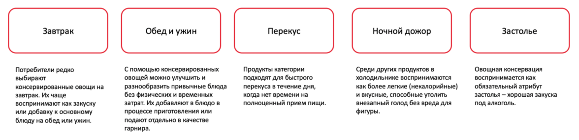 Чаще всего консервированные овощи потребляют на обед, ужин и на застольях. В этих ситуациях консервы воспринимаются как помощники или обязательные традиционные атрибуты.