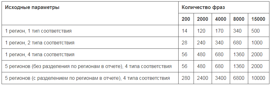Для наглядности приведем примеры бюджета в зависимости от количества фраз, регионов и типов соответствия: