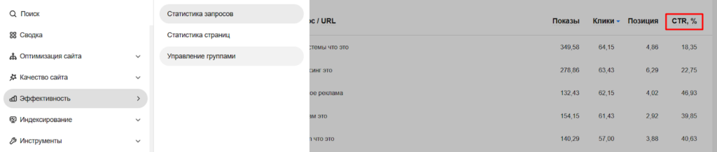 Если сайт добавлен в Яндекс Вебмастер и работает как минимум несколько месяцев, данные по CTR будут доступны в отчете «Эффективность» → «Управление группами».