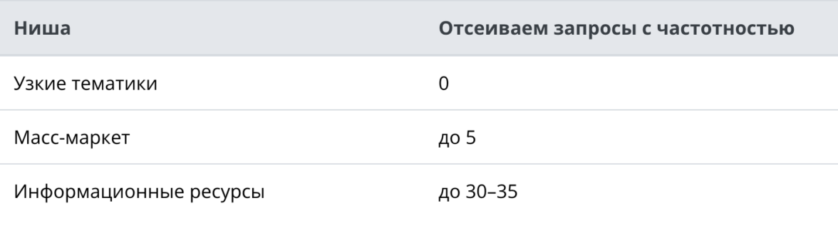 В зависимости от ниши и типа сайта нижний порог частотности, по которому нужно отсекать бесперспективные запросы, отличается. Для ориентира можете использовать следующие данные: