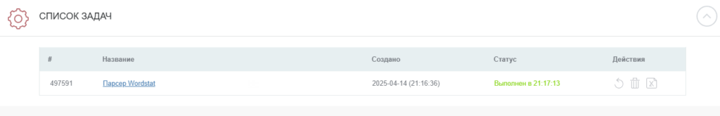 В разделе «Список задач» отобразится статус задачи. Если парсинг завершен, отобразится статус «Выполнен». Можно скачивать отчет в XLSX-файле.