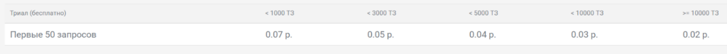 Первые 50 запросов можно спарсить бесплатно. Последующий парсинг платный. Для расчета стоимости используется базовая единица — ТЗ.