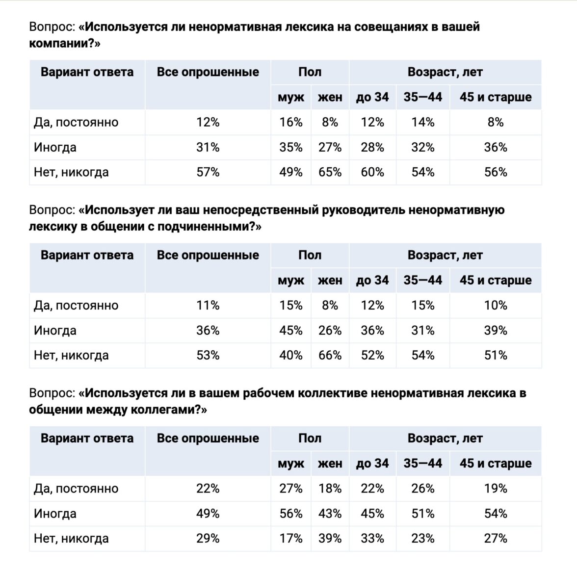 47% респондентов отметили, что их непосредственный руководитель матерится, общаясь с подчиненными (11% дали ответ «да, постоянно», 36% — «иногда»). Об использовании ненормативной лексики на рабочих совещаниях сообщили также 47% опрошенных. Вопрос о том, делает ли кто коллегам замечания по поводу матерщины, социологи не задавали.