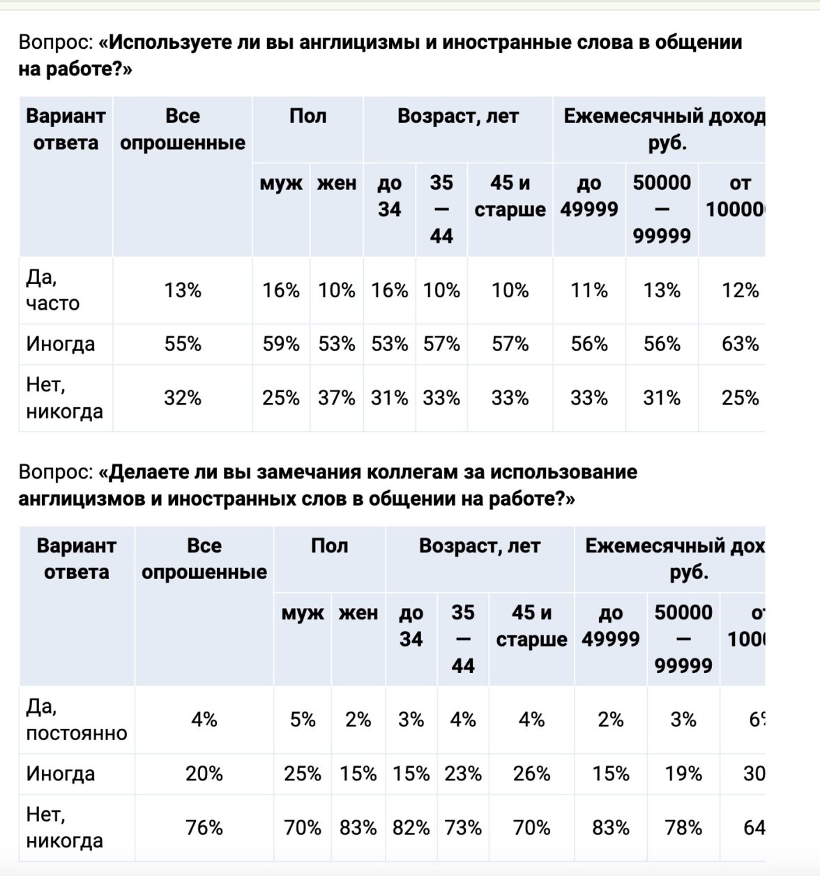 Те, кому еще не исполнилось 35 лет, используют иностранные слова чаще, чем их более старшие коллеги. Мужчины пользуются англицизмами чаще женщин. Но и замечания другим мужчины делают чаще, чем женщины. Кроме того, те, кто зарабатывает более 100 тыс. рублей в месяц, склонны делать замечания другим чаще, чем те, чья зарплата не дотягивает до этой суммы.