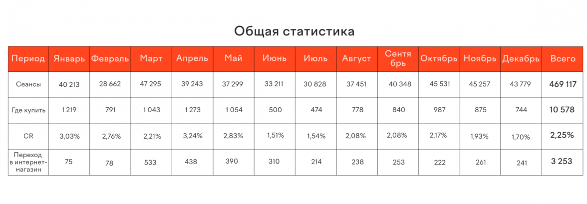 В результате проведения рекламной кампании мы привлекли 469 117 сеансов с конверсией в 2,25% в переход на страницу «где купить».