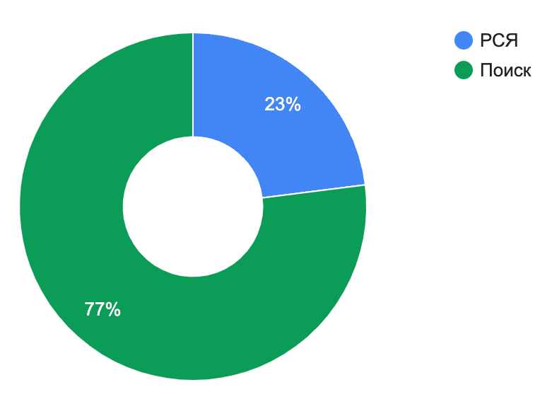 Сейчас основная часть заявок приходит с поисковых кампаний с оплатой за клики, однако и с РСЯ мы также получаем целевые обращения. Ниже представлена диаграмма по распределению заявок между Поиском и сетями.