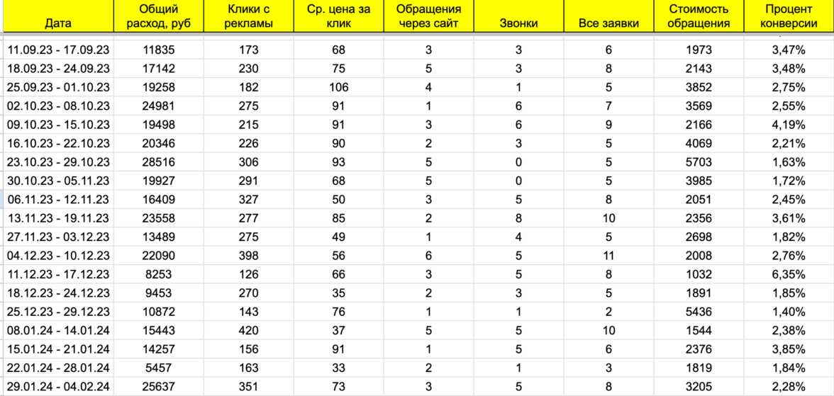 В этой нише такое количество заявок не пугает клиента, так как средний чек у него от 500 000 рублей. Поэтому заказчик доволен нашими результатами и сотрудничает с нами уже год.