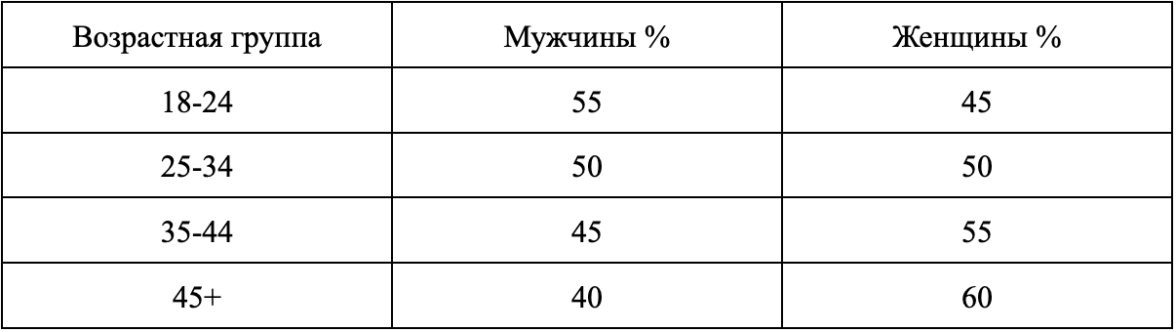Знание пола и возраста аудитории ВКонтакте — это важный элемент стратегии продвижения и контент-маркетинга на этой платформе. На основе данных Brand Analytics мы сформировали таблицу: