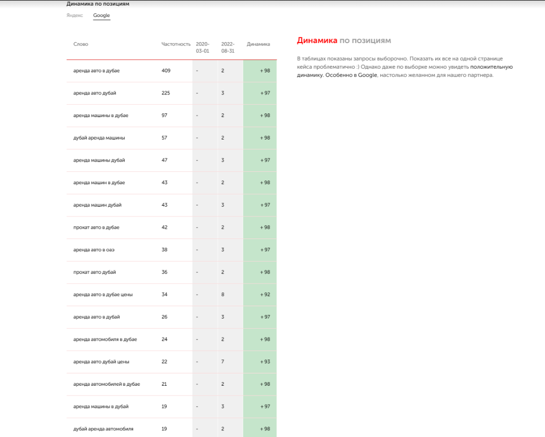 За 2,5 года работы по продвижению сайта по аренде авто в Дубае мы вышли на следующие результаты: