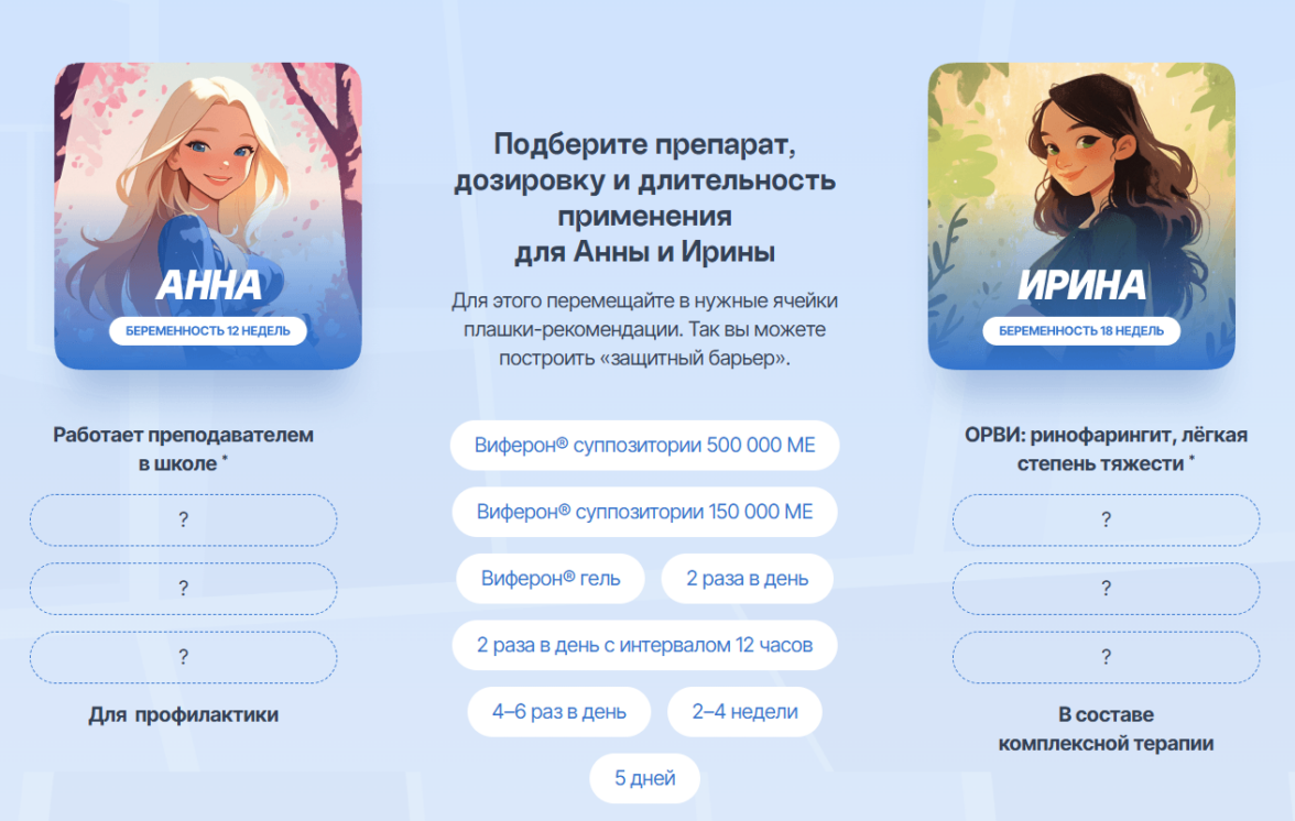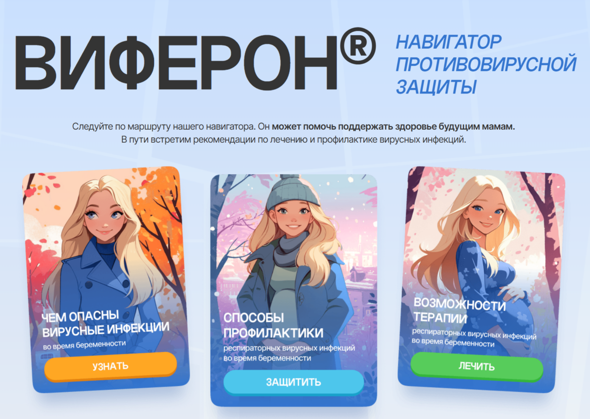 Был создан «Навигатор противовирусной защиты». Следуя по его маршруту, врач изучал рекомендации по терапии вирусных инфекций у беременных. Формат портретов пациентов был представлен по триместрам: