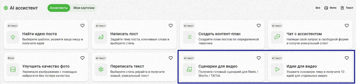 Если писать сценарии тяжело, можно использовать ИИ Ассистента SMMplanner. В нём доступны два варианта: генерация идей для роликов и готовых сценариев. Достаточно описать тему — остальную часть подготовки ассистент возьмёт на себя (кроме съёмки).