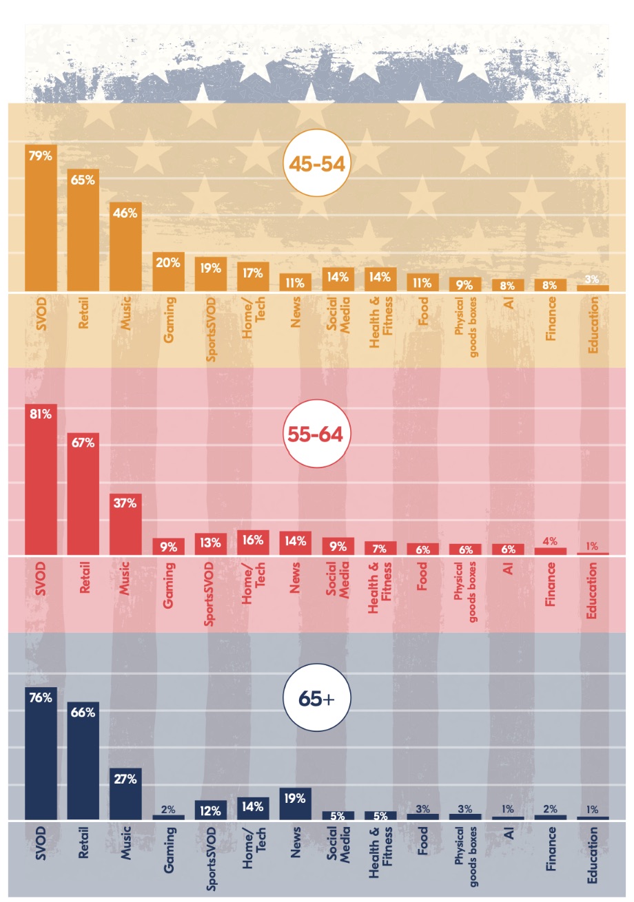 Популярность цифровых подписок у жителей США в возрастных категориях 45–54 лет, 55–64 лет, 65 лет и старше. Категории (слева направо): видео по запросу, розничная торговля, музыка, гейминг, спортивные трансляции по запросу, бытовая техника, новости, социальные сети, здоровье/фитнес, продукты, доставка физических продуктов, искусственный интеллект, финансы, образование.