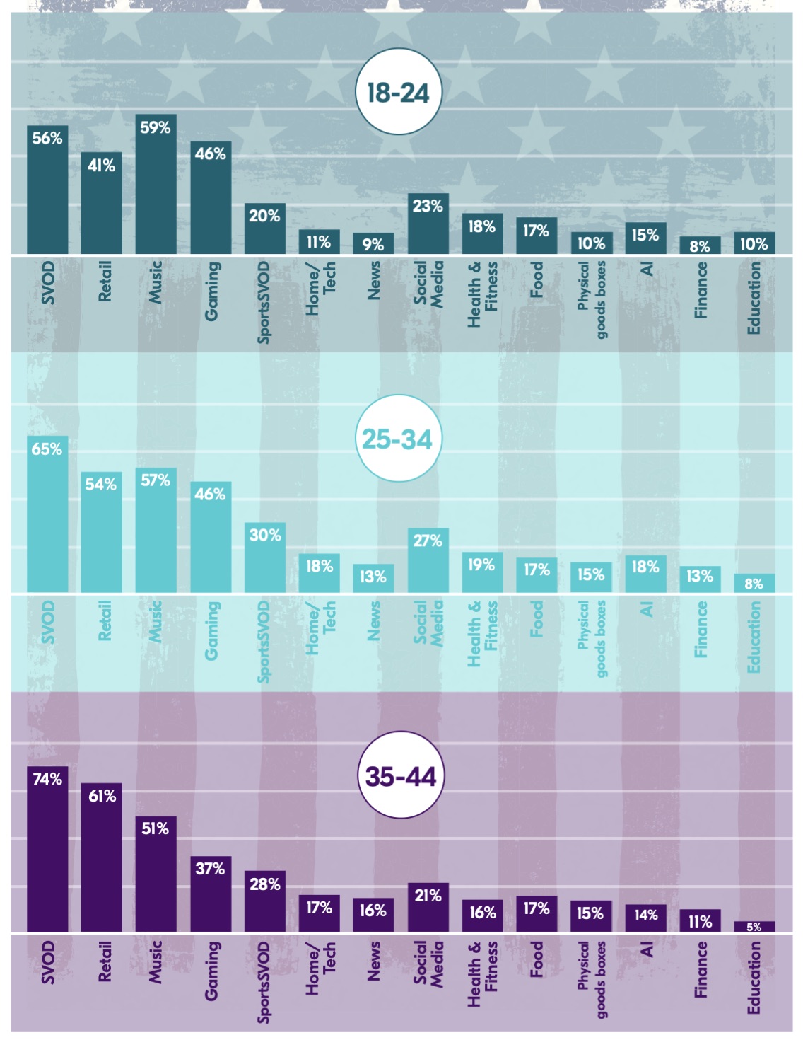 Популярность цифровых подписок у жителей США в возрастных категориях 18–24 лет, 25–34 лет, 34–44 года. Категории (слева направо): видео по запросу, розничная торговля, музыка, гейминг, спортивные трансляции по запросу, бытовая техника, новости, социальные сети, здоровье/фитнес, продукты, доставка физических продуктов, искусственный интеллект, финансы, образование.