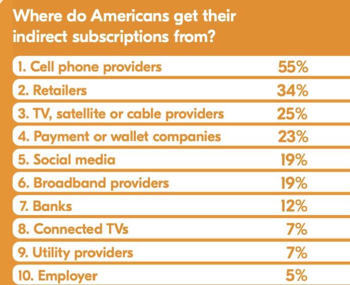 У кого американцы покупают непрямые подписки. Продавцы (сверху вниз): операторы сотовой связи, компании розничной торговли, поставщики услуг телевидения, компании платежных услуг, платформы соцсетей, поставщики широкополосного доступа в интернет, банки, компании подключенного к интернету телевидения, поставщики коммунальных услуг, работодатели.