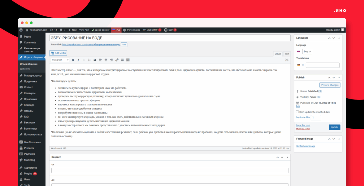 Административная панель CMS WordPress для проекта образовательного центра для детей «Чемодан сказок».