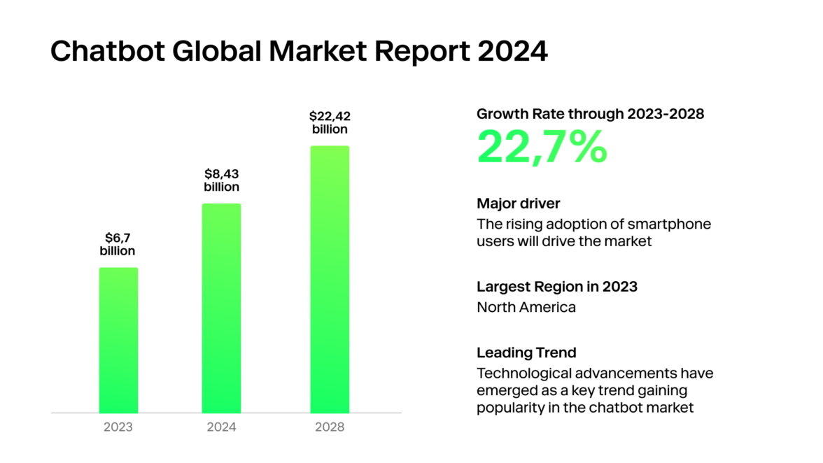 Объем рынка чат-ботов стремительно растет. В 2023 году он составил $6,7 млрд, а к концу 2024 года, по прогнозам, достигнет $8,43 млрд. К 2028 году его ожидаемый объем составит $22,42 млрд, а среднегодовой темп роста — 27,7%.