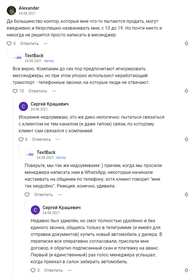 Выдвинули гипотезу — агенты по недвижимости «сливают» тех, кто предпочитает общаться в мессенджерах, а не созваниваться. Почему важно общаться в мессенджерах? Потому что многим неудобно разговаривать по телефону (человек занят, не может говорить, в квартире спит ребенок и так далее). И если потенциальный клиент настаивает на общении в WhatsApp, не нужно заставлять его говорить по телефону. Почему именно рынок недвижимости? Потому что там очень дорогие лиды (от 2,5 до 10 тыс. рублей в среднем). Кроме того, покупка/аренда недвижимости — больной вопрос для многих людей, как и сама ситуация, когда менеджер не хочет качественно выполнять свою работу и игнорирует просьбы клиента. Тема тяжелая, отсюда и 79 комментариев под нашим материалом на vc.ru.